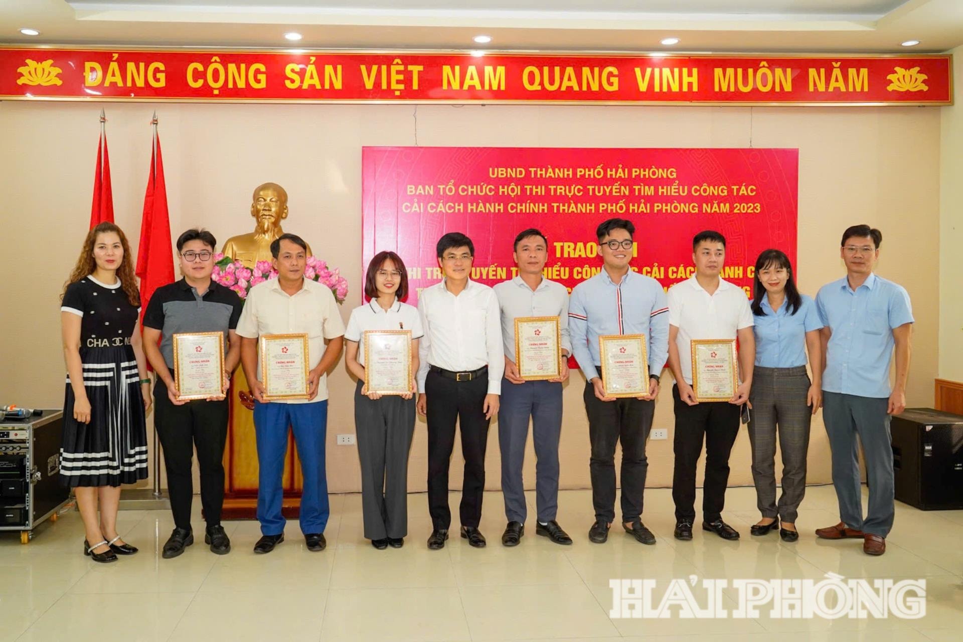 Đại diện lãnh đạo Sở Nội vụ trao giải cho các cá nhân đạt thành tích cao trong Hội thi trực tuyến tìm hiểu công tác cải cách hành chính thành phố Hải Phòng năm 2023.